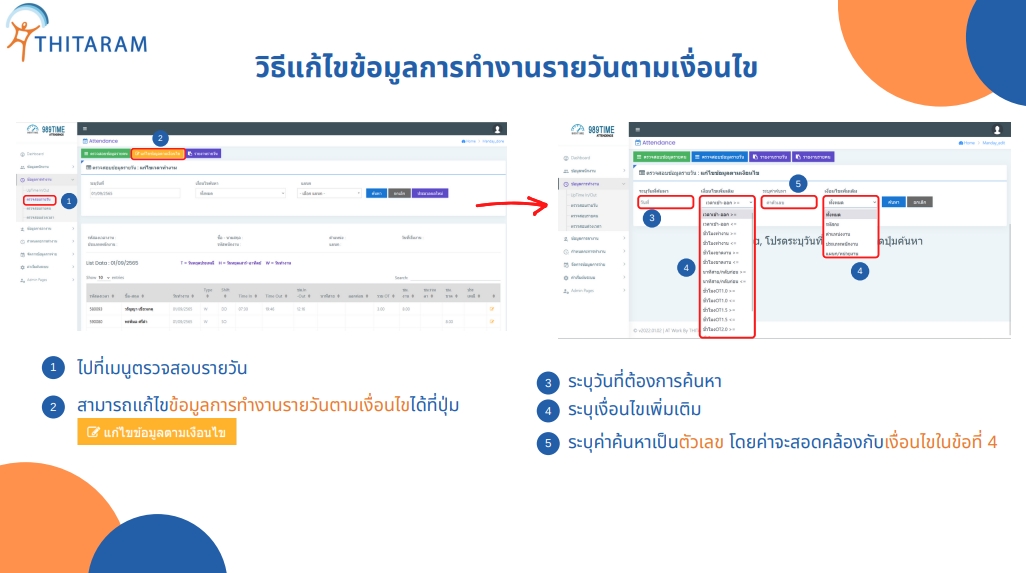 สามารถเเก้ไขข้อมูลการทำงานรายวันตามเงื่อนไขได้ที่ปุ่ม แก้ไขข้อมูลตามเงื่อนไข