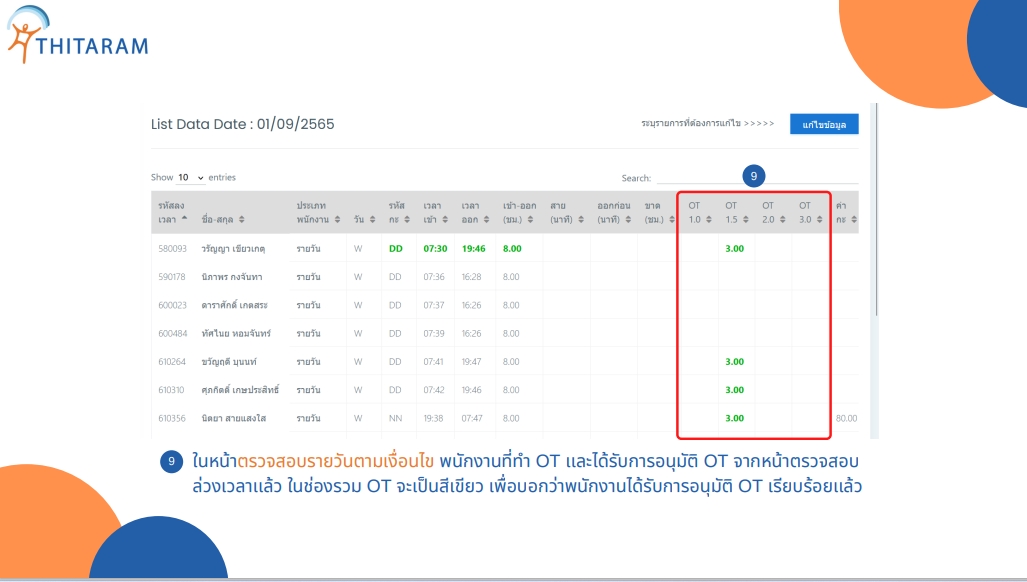 ในหน้าตรวจสอบรายวันตามเงื่อนไข พนักงานที่ทำ OT เเละได้รับการอนุมัติ OT จากหน้าตรวจสอบล่วงเวลาเเล้ว ในช่องรวม OT จะเป็นสีเขียว เพื่อบอกว่าพนักงานได้รับการอนุมัติ OT เรียบร้อยเเล้ว