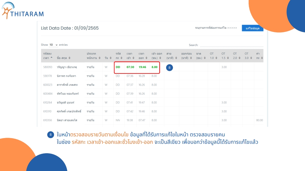 ในหน้าตรวจสอบรายวันตามเงื่อนไข ข้อมูลที่ได้รับการเเก้ไขในหน้า ตรวจสอบรายคน ในช่อง รหัสกะ เวลาเข้า-ออกเเละชั่วโมงเข้า-ออก จะเป็นสีเขียว เพื่อบอกว่าข้อมูลนี้ได้รับการเเก้ไขเเล้ว