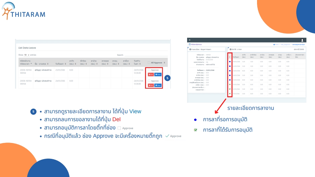 - สามารถดูรายละเอียดการลางาน ได้ที่ปุ่ม View - สามารถลบการขอลางานได้ที่ปุ่ม Del - สามารถอนุมัติการลาโดยติ๊กที่ช่องว่างสี่เหลี่ยม approve - กรณีที่อนุมัติแล้ว ช่อง Approve จะมีเครื่องหมายติ๊กถูก